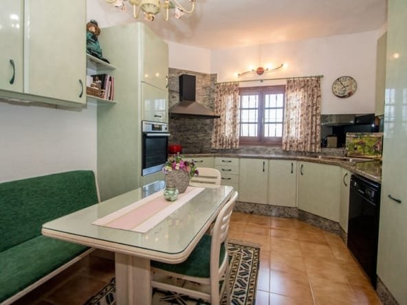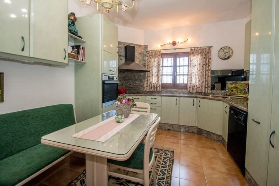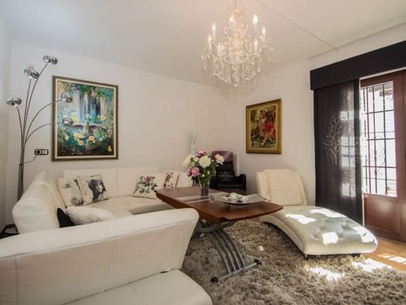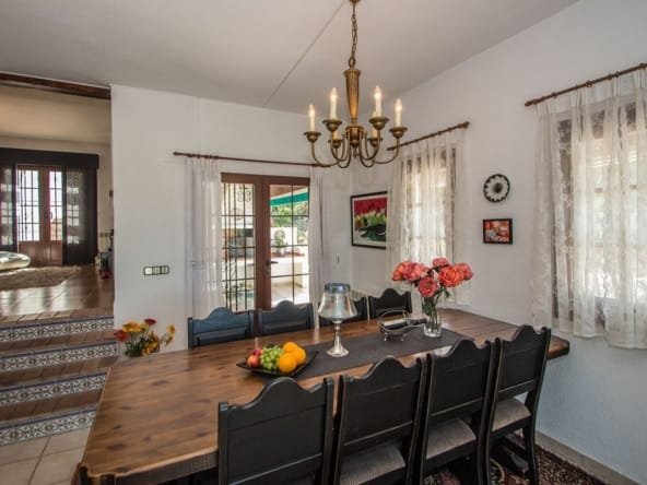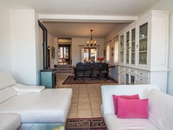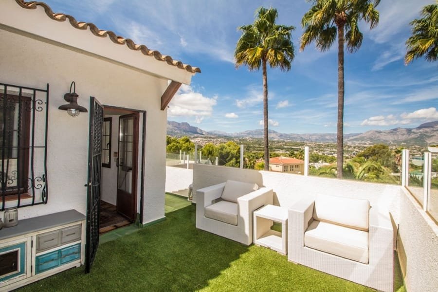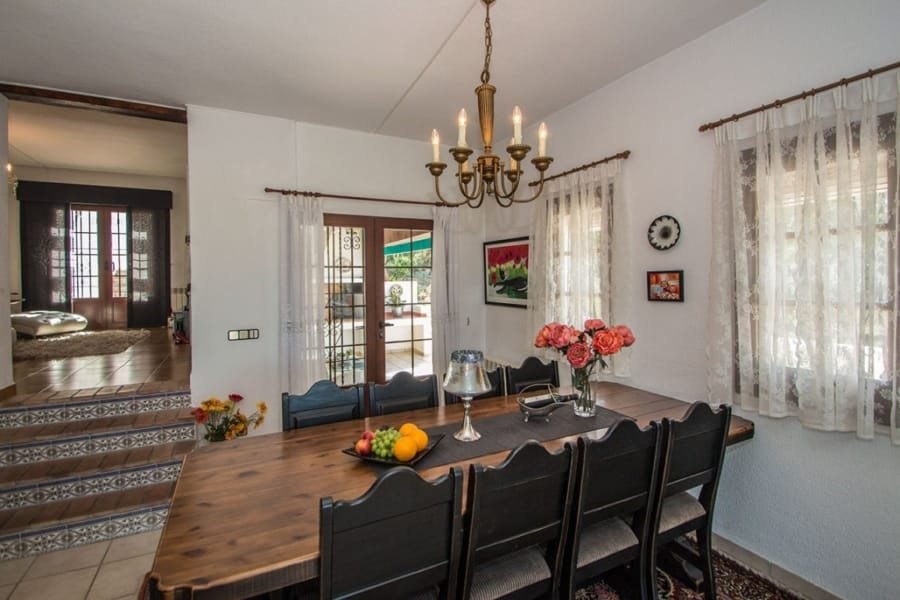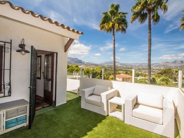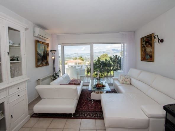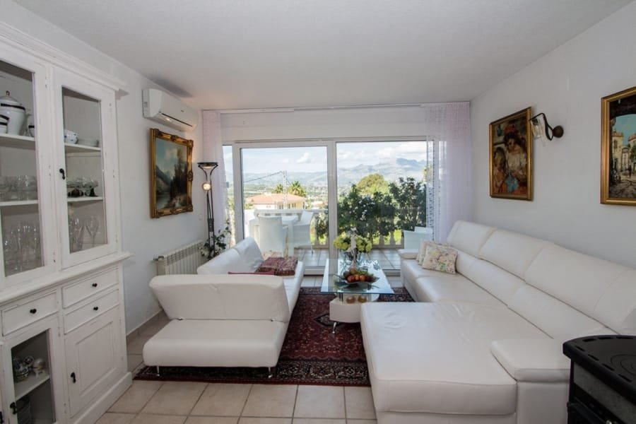 Charming living area with 2 living rooms with dining area, open views, fireplace, radiators, air condition and placed next to the kitchen, that can be connected to the living room. Has 3 very spacious bedrooms with en suite bathrooms, and an extra room/office upstairs. In the basement is a big area, a laundry room, storage rooms etc that can be changed into eg. a guest apartment. Many terrace areas with views to the mountains, and there is a cosy covered area next to the heated salt water pool and an outdoor BBQ/kitchen area. There is a carport and parking area and many posibilities at the plot of 1.485 m2. Located in a quiet area of Albir, near the nature and part of urbanisation with 2 communal tennis courts and extra water suply.